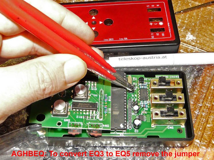 Mit der AGHBeq3/AGHBeq5 Handbox kann man alle Synta EQ3 und EQ5 (und andere schrittzahlkompatible) standard-Steuerung betreiben. Der "Schalter" zwischen EQ3- und EQ5-Betrieb ist ein versteckter Jumper auf der Hauptplatine, welcher entweder aufgesetzt ist (EQ3) oder nicht aufgesetzt ist (EQ5).