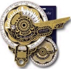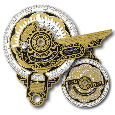 - ein prachtvolles Kartonreplikat einer Sternenuhr nach Originalen aus dem 17. Jahrhundert: Es zeigt die Zeit mit Hilfe von Polarstern und Großem Wagen an, man kann sie im Dunkeln sogar mit den Fingerspitzen ertasten. Auf der Rückseite befindet sich ein Seemanns-Astrolabium, mit dem sich bei Tag die Höhen von Sonne, Landmarken oder Gebäuden bestimmen lassen. (Gestanzter, massiver A3 Karton, mit edlem Golddruck.)