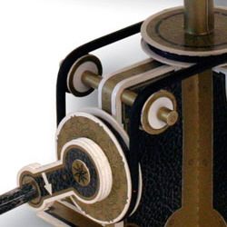 Eine Kurbelumdrehung an dem sorgfältig berechneten Getriebe aus Gummiriemen und Rillenrädern entspricht dem Ablauf einer Woche und ruft sechs verschiedene, gleichzeitige Bewegungen hervor, die zueinander im angenäherten Verhältnis der tatsächlichen Umlaufzeiten stehen.