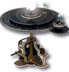 Mit dem Kopernikus-Planetarium bietet AstroMedia* erstmals ein mechanisches Planetenmodell an, das die Bewegungen der inneren Planeten Merkur und Venus sowie des Mondes und der Erde zeigt, wobei diese sich um ihre schräg stehende und immer gleich ausgerichtete Achse drehen.