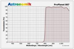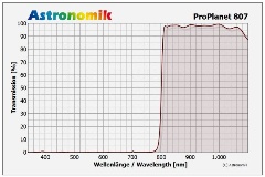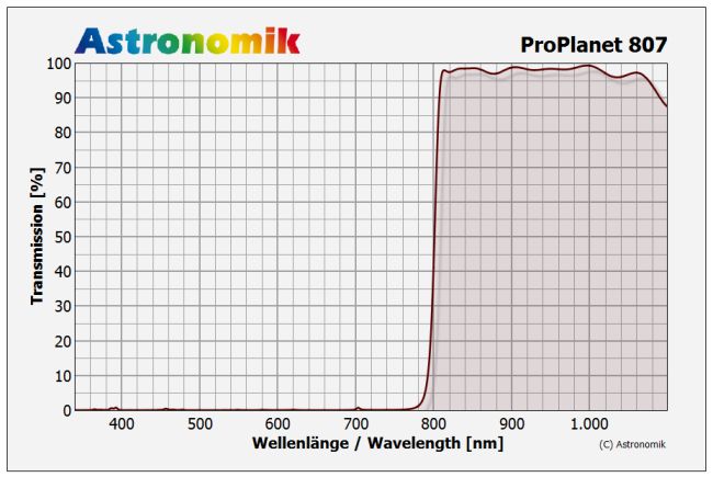Der ProPlanet IR 807 Filter schneidet den sichtbaren Teil des Spektrums ab und öffnet erst ab einer Wellenlänge von 807nm. Dadurch werden die auf das Seeing besonders empfindlich reagierenden Bereiche des Lichts geblockt und die für Seeing deutlich weniger empfindlicheren Bereiche des langwelligeren Lichtes durchgelassen. Ein solches Vorgehen vermindert sichtbar die Seeingprobleme bei der Planeten- und Mondfotografie, ohne erhebliche Empfindlichkeitseinbußen auf Seiten des bildgebenden Sensors.