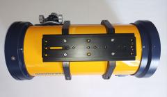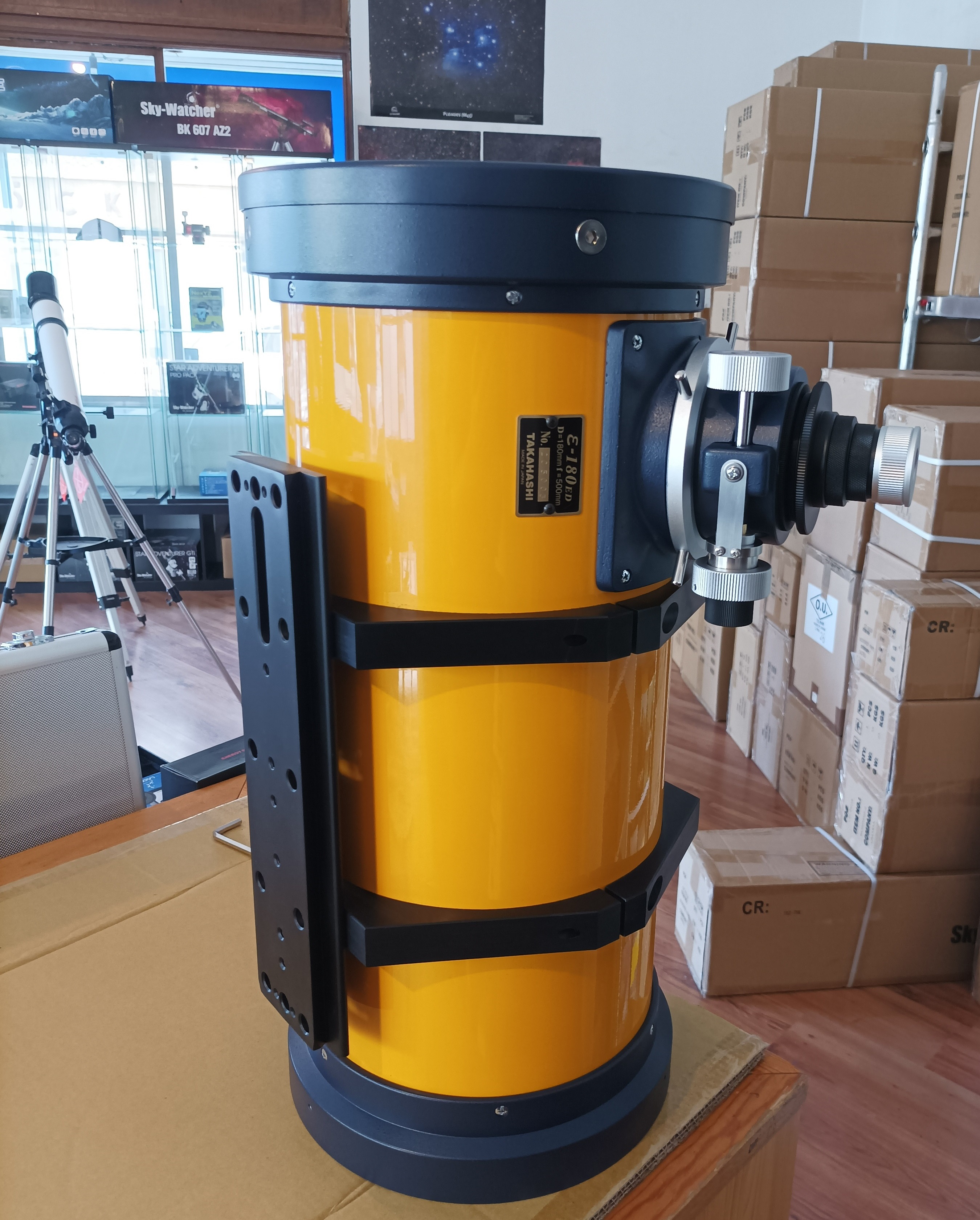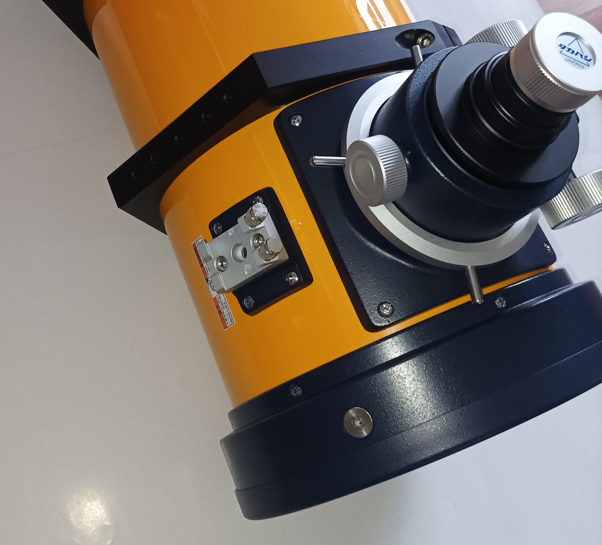 der Tubus kann daher auch aufrecht abgestellt werden. Am Tubus sind zwei Aufnahmen für Sucherteleskope vorhanden (eine vorne beim OAZ, eine auf der gegenüberliegenden Seite hinten beim Hauptspiegel), hier können die Takahashi 6x30 und 7x50 Sucher befestigt werden, mit der FindFFTKup Klemme können auch andere Sucher oder Guidescopes montiert werden.