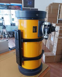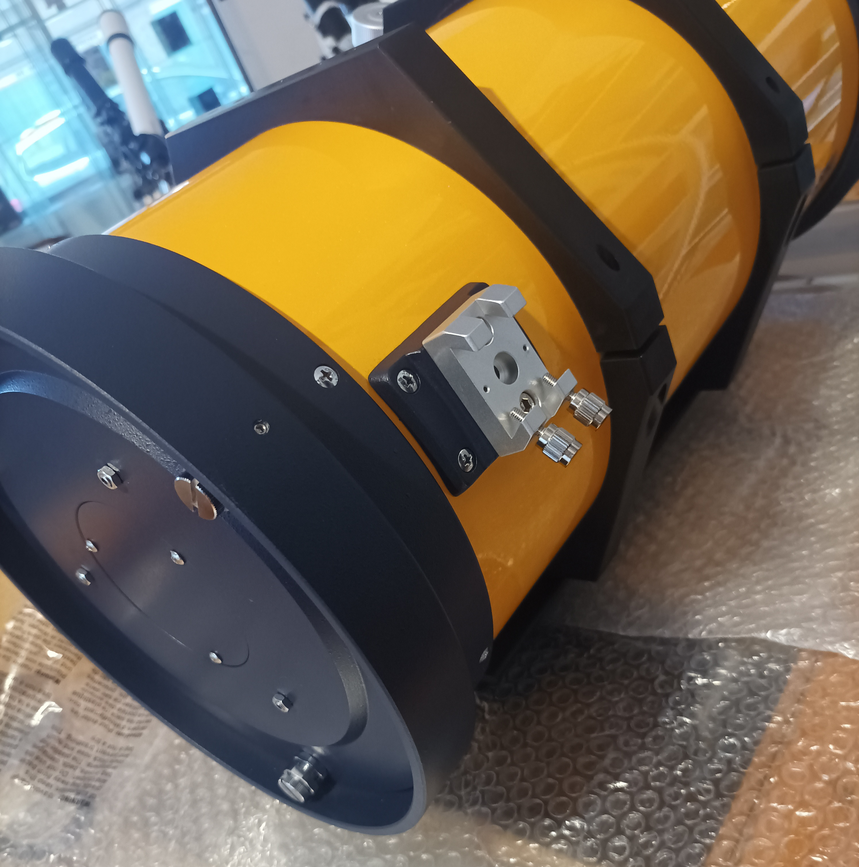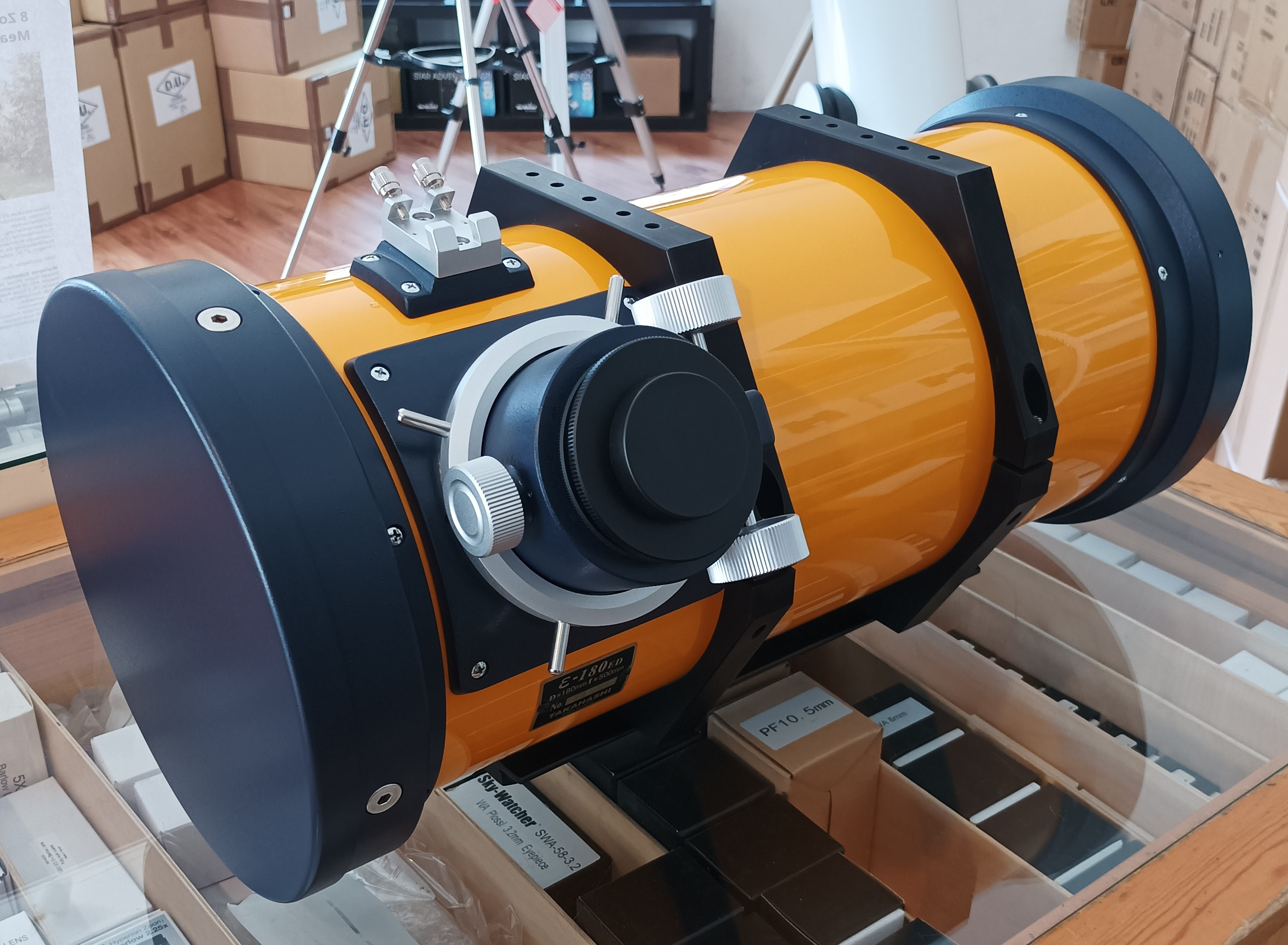 Der hyperbolische Hauptspiegel sitzt in einer massiven Fassung, er kann mit drei großen Sechskant-Schrauben justiert werden, man benötigt dazu einen 19mm Gabelschlüssel. Obwohl diese Geräte sehr lichtstark sind, muss man sie selten bis nie nachjustieren. Der Okularauszug ist ein stabiler Zahn-/Trieb-Auszug, der an der Basis rotierbar ist und dabei mit einem vollumfassenden Klemmring gehalten wird, das ist auch bei schwersten Zuladungen stabil. Der Auszug kann mit dem Mikrofokus MEF-3 nachgerüstet werden, das ist bei so lichtstarken Geräten absolut empfohlen, wir bieten aber auch einen passenden Adapter für unseren Lacerta MFOC-Motorfokus an. Der zweilinsige Korrektor ist im Okularauszug verschraubt, Adapter auf 1,25“ gehören zum Lieferumfang. Der Tubus ist extrem massiv, das Rohr besteht aus mehrere mm dicken Aluminium, hinten bei der