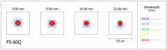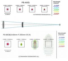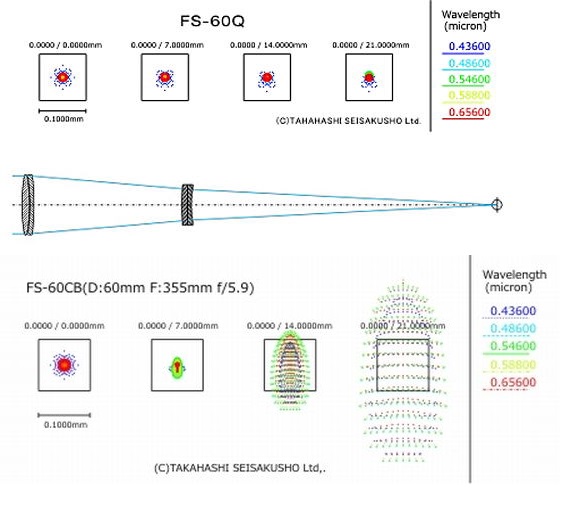 Den kompakten 60mm Fluorit Apo gibt es bereits werkseitig mit dem 1,7x CQ-Modul als FS-60Q, ein 60/600 f/10 Quadruplet Apo. Optisch ist diese Version dem FS-60CB überlegen, das Q-Modul reduziert die sphärische und chromatische Aberration und ebnet zusätzlich auch das Bildfeld, beachten Sie das Spot-Diagramm des FS-60Q unten im Vergleich zum FS-60CB. Er ist aber genauso universell wie der FS-60CB, schraubt man das Q-Modul heraus, hat man ein Richfield-Teleskop, also zwei Teleskope in einem. Ohne Q-Modul und mit dem optional erhältlichen 2 Zoll-Anschluss samt 2 Zoll Zenitspiegel und Weitfeldokularen kann man über 7° tatsächliches Gesichtsfeld erreichen, man kommt somit schon in den Bereich von Ferngläsern.