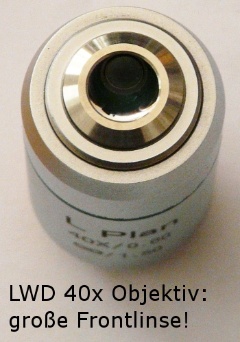 Da in der Praxis alle diese Abläufe ein stärkeres Deckglas brauchen, sind die LWD Objektive nicht mit 0,17mm, sondern mit 1,5mm optischem Glasweg gerechnet. Weiterhin weisen diese Objektive eine bessere Randkorrektur, d.h. wenige Randverzerrung auf.