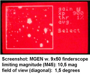 Der LACERTA M-GEN stand alone autoguider ist sehr empfindlich. Mit einem 8x50 Sucher kann man bei einer Integrationszeit von 1 sec auf einen 11-mag-Stern sicher nachführen (Bilddiagonal ist 1.5 Grad! - siehe M45 Photo links). In der Praxis ist es uns aber gelungen mit demselben "Leitrohr" bei einer Integrationszeit von 4 sec auf einen 12-mag-Stern nachzuführen.