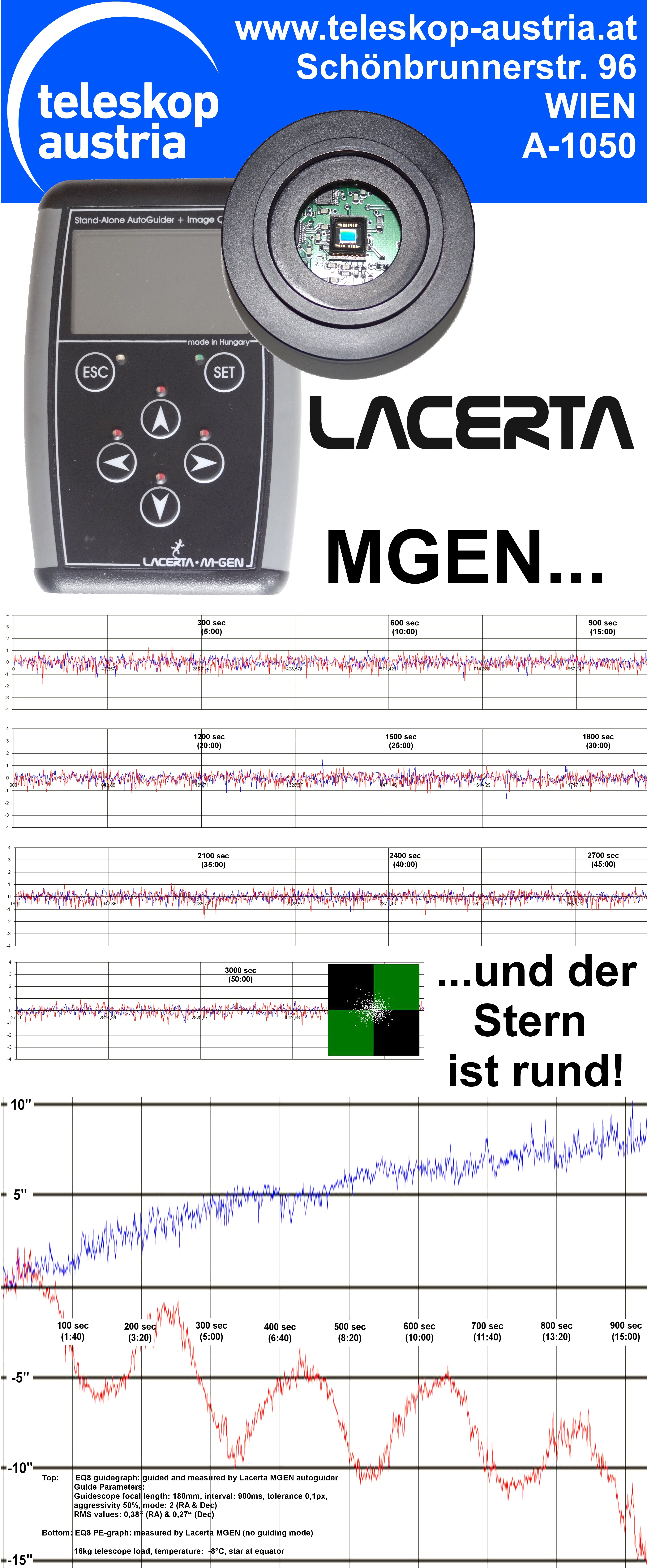 weniger als 1 Minute. Mit seiner Subpixel Genauigkeit, Stand-Alone-, Remote- und ASCOM betrieb, ist MGEN sicher der beliebteste und verlässlichste Autoguider am Markt. Noch dazu vollständig in Europe entwickelt, hergestellt und bereits mehr als 3000 Exemplare sind in Verwendung. MGEN wird nicht nur von Amateurastronomen und Privatsternwarten geschätzt, sondern auch professionelle Forschungen, wie das HATnet, mit über 60 Extrasolare Planetenentdeckung, setzen auf MGEN Autoguider.