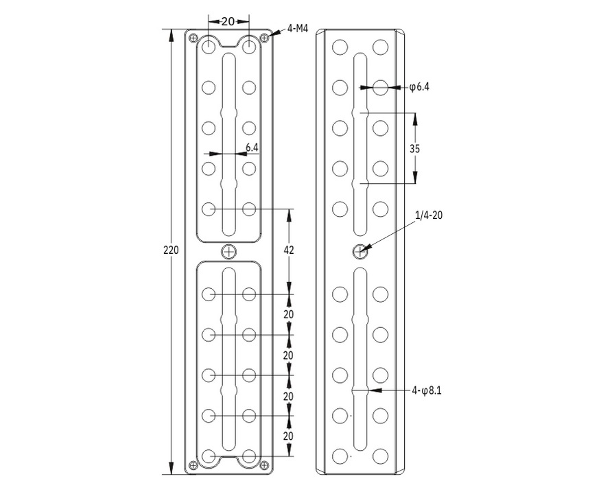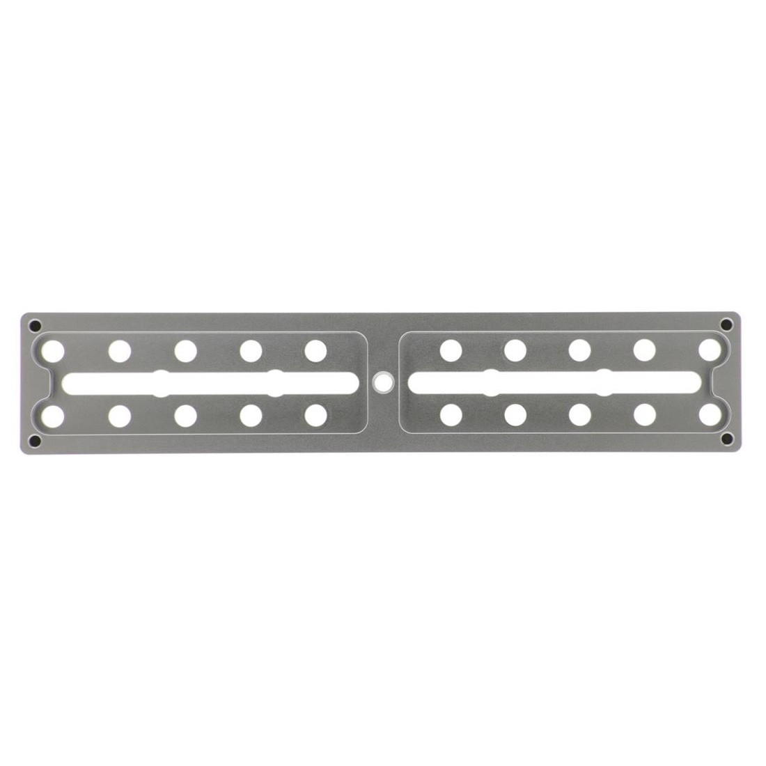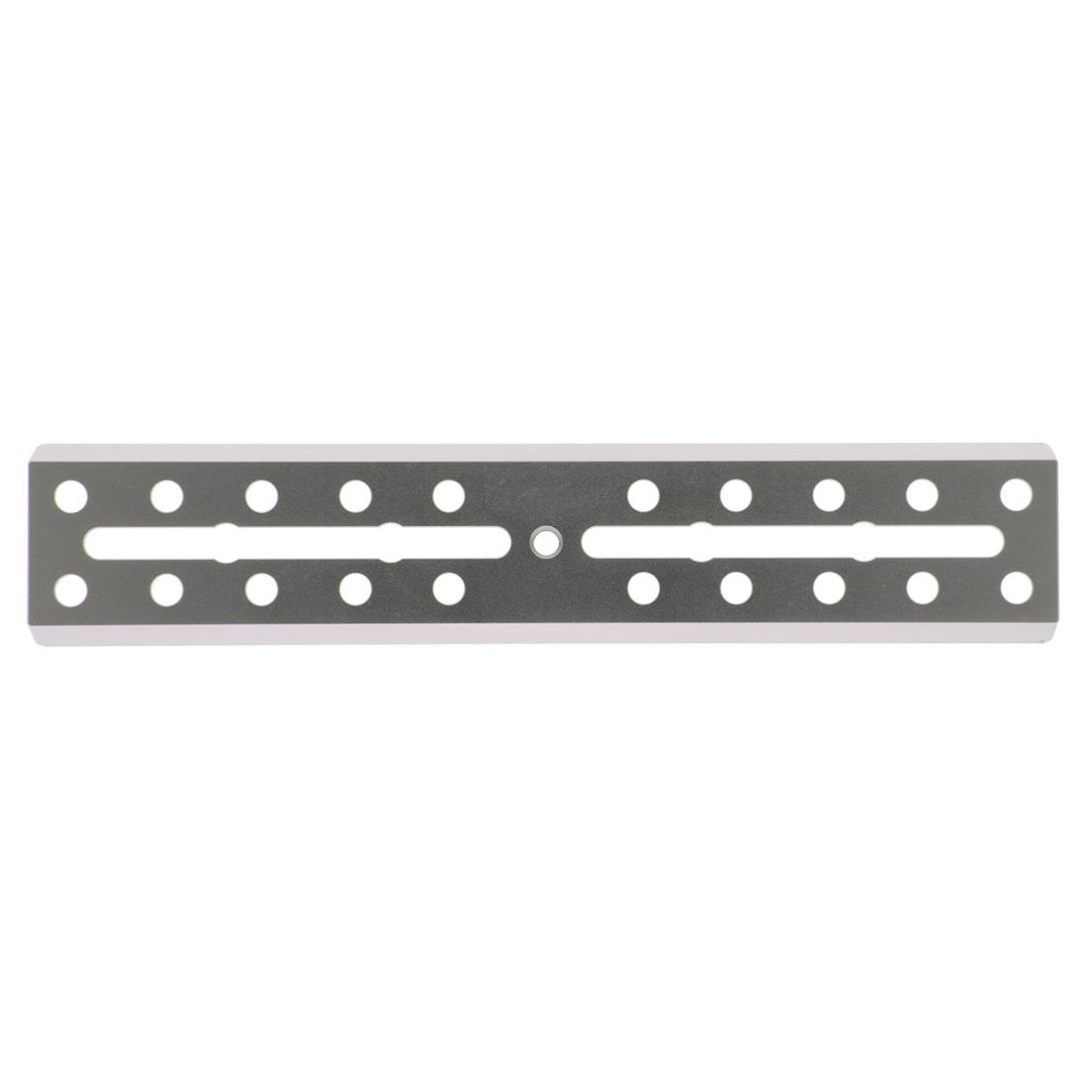 Zwei Langlöcher für M6- und 1/4"-Schrauben mit jeweils zwei Erweiterungen für M8 mit 35mm Abstand, zentrales 1/4" Gewinde.