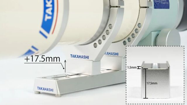 Takahashi Rohrschellen-Backen für TKA11420 Schellen am FSQ-80FC, der Abstand des Tubus zur Prismenschiene erhöht sich um 17,5mm. Damit hat man mehr Platz für Fokusmotoren, Filterräder, usw...