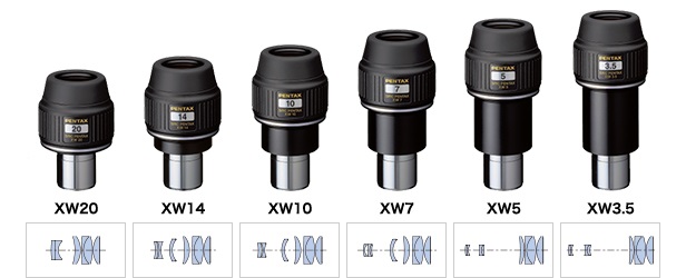 Die Pentax XW-Serie zählt zu den erfolgreichsten Okularserien am Markt. Großes Sehfeld vom 70° gepaart mit einheitlichen Augenabstand von 20mm bei allen Brennweiten garantiert höchsten Beobachtungskomfort. Die Pentax SMC-Vergütung sorgt für maximale Transmission, der optische Aufbau besteht je nach Brennweite aus sechs bis acht Linsen, es wurde mechanisch viel Bauaufwand für eine möglichst gute Streulichtunterdrückung betrieben. Die Augenmuscheln können durch Drehen in der Höhe verstellt werden, so dass egal ob mit oder ohne Brille, immer ein bequemer Einblick gegeben ist. Unter der Augenmuschel findet man ein M43-Gewinde, mit passendem Adapter können hier Kameras zur Okularprojektion angeschraubt werden.